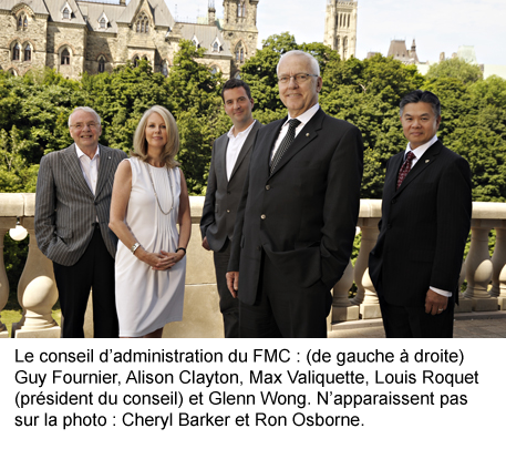 Le conseil d’administration de la société est entièrement indépendant de la direction du FMC, de ses bailleurs de fonds et des bénéficiaires de ses programmes. Les administrateurs sont nommés par les organismes membres de la société, soit la Coalition canadienne pour l’expression culturelle, le CDC-CCD, qui représente les cinq distributeurs canadiens de câble et de satellite les plus importants (cinq administrateurs), et le Gouvernement du Canada, par l’entremise du ministère du Patrimoine canadien (deux administrateurs).